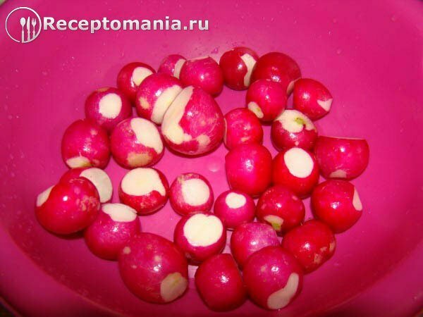 У редиса отрезаем ботву и корешки, тщательно моем.