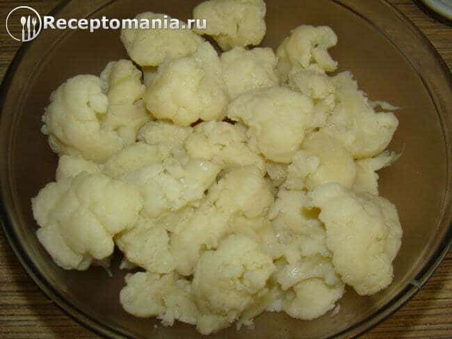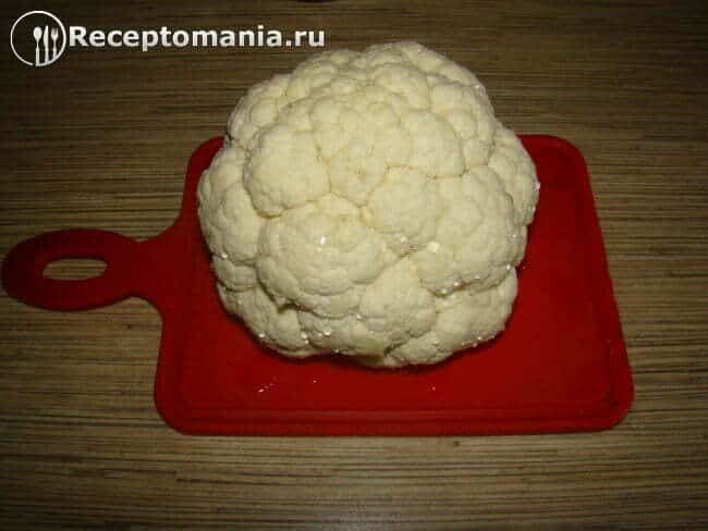 Цветную капусту помыть, разрезать на четыре части и опустить в кипящую подсоленную воду. Варить 15 минут.