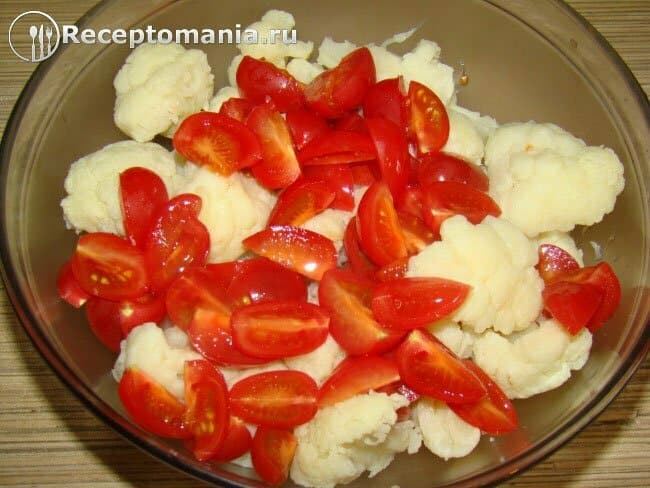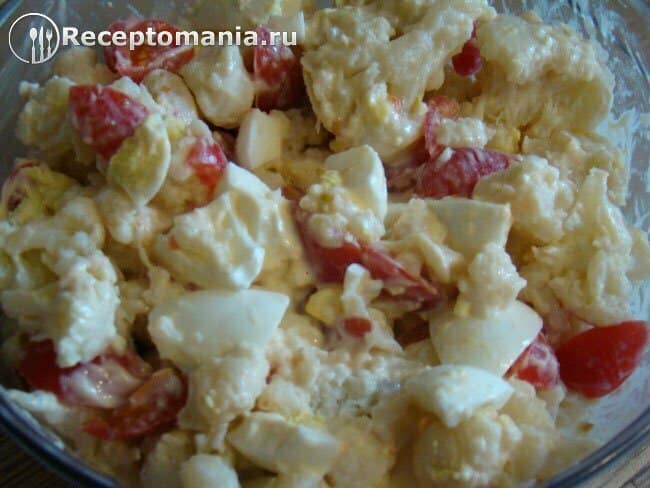 Цветная капуста свежая – 1 кг. Помидоры «Черри» - 300 гр. Яйца – 5 шт. Майонез СольПриготовление: