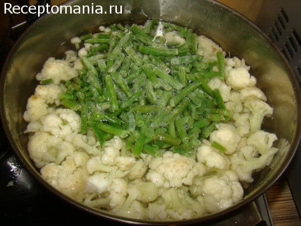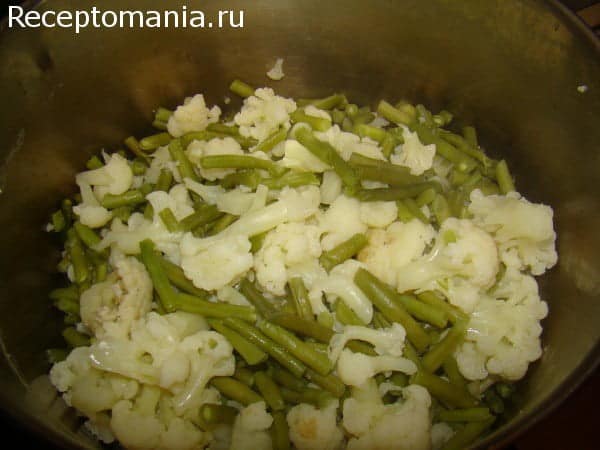 Цветную капусту разделяем на соцветия и опускаем в кипящую воду вместе со стручковой фасолью, отвариваем около 10 — 15 минут.