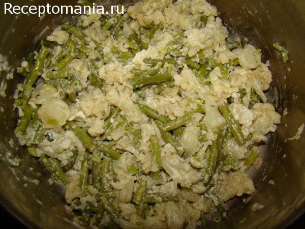 Цветная капуста – 800 гр. Фасоль стручковая – 400 гр. Соевый соус – 5 ст.л. Майонез – 2 ст.л. Чеснок – 1-2 зубчикаПриготовление: