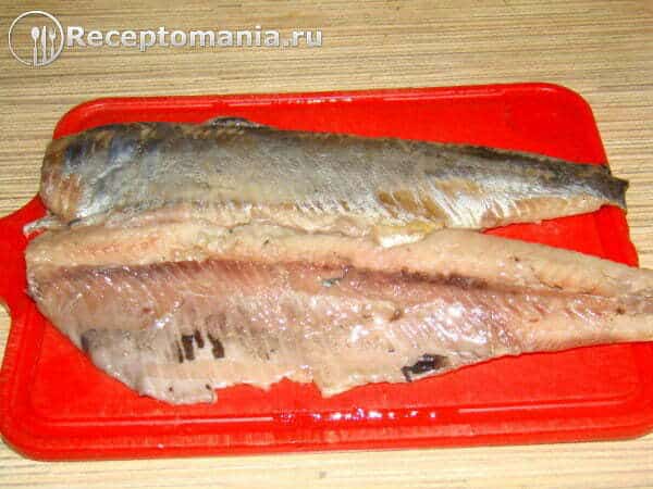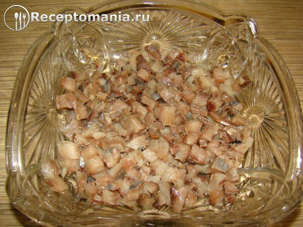 Селедка – 1 шт. Лук – 1 шт. Зеленый горошек – 400 гр. Яйца – 5 шт. Картофель – 2-3 шт. Морковь - 1 шт. Свекла – 2 шт. Майонез СольПриготовление: