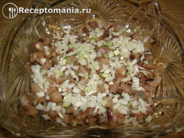 Нарезаем кубиками небольшую головку лука и смазываем майонезом.