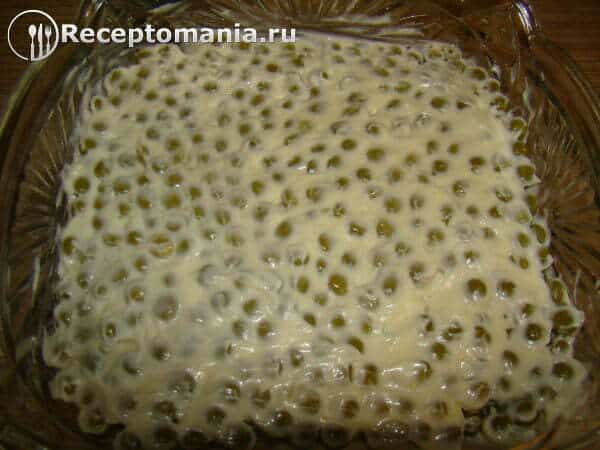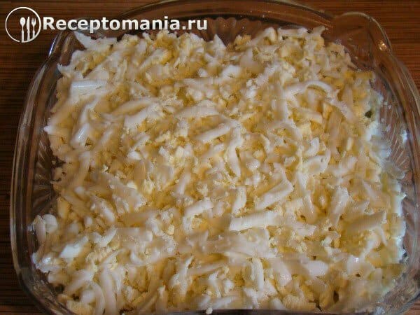 Отвариваем яйца в подсоленной воде 10 мин, очищаем от скорлупы и натираем на крупной терке, смазываем майонезом.
