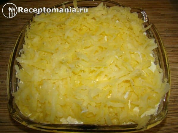 Предварительно отвариваем овощи: картофель и морковь 20-30 минут в зависимости от сорта и свеклу 1 час. Очищаем от кожуры. Далее делаем следующий слой, натираем картофель на крупной терке, немного солим и смазываем майонезом.