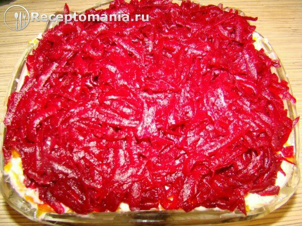 Натираем на крупной терке свеклу и смазываем майонезом.