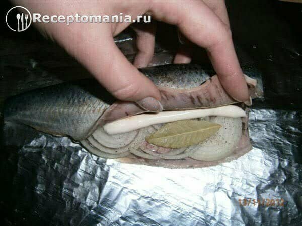 Рыбу выкладываем на фольгу, натираем солью, перцем или приправой, вовнутрь кладем нарезанный полукольцами лук, небольшой листочек лаврового листа, немного майонеза и черного молотого перца или приправу для рыбы. Сверху селедку обмазываем майонезом, посыпаем укропом.
