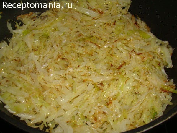 Нарезаем капусту, выкладываем на сковороду с растительным маслом и обжариваем 20 минут.