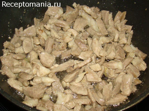 Нарезаем свинину, выкладываем на сковороду с растительным маслом и обжариваем 20 минут.