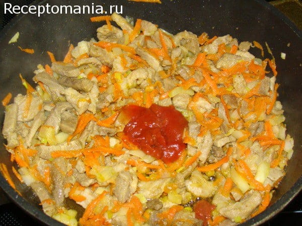 После добавляем к мясу морковь, натертую на крупной терке и лук, нарезанный кубиками, обжариваем до полуготовности. Затем кладем томатную пасту.