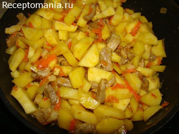Следом добавляем картофель, обжариваем 10 минут.