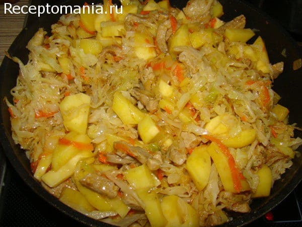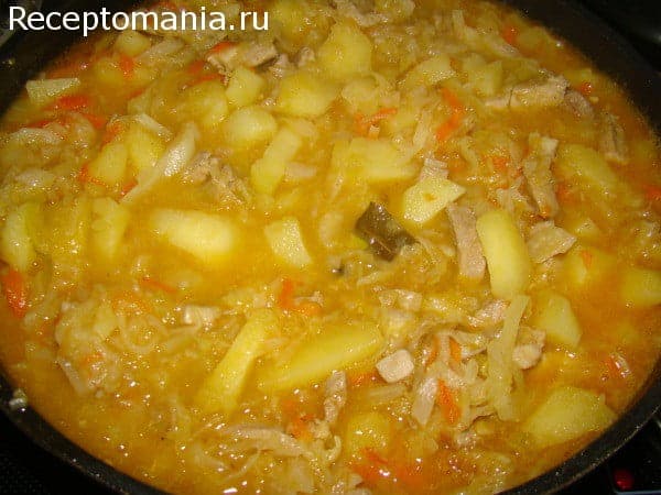 Свинина – 500 гр. Капуста свежая – 1 кг. Картофель – 8-10 шт. Морковь – 1 шт. Лук – 1 шт. Томатная паста – 1 ст.л. Вода горячая – 750 мл. Растительное масло Лавровый лист Перец черный молотый СольПриготовление: