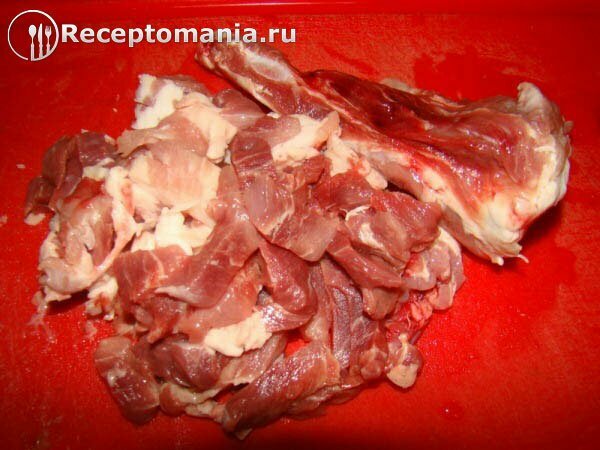 В кастрюлю с холодной водой кладем свинину. Варим 40 мин.