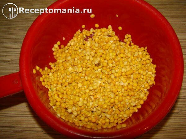 В бульон добавляем дробленый горох, предварительно промытый проточной водой. Варить еще 20 мин.