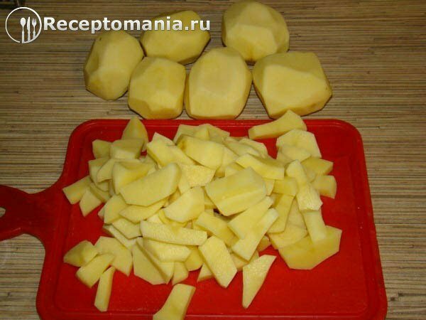 Далее добавить нарезанный соломкой картофель. Варить до готовности картофеля.