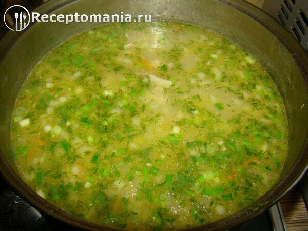 Выключить суп и добавить зелень.