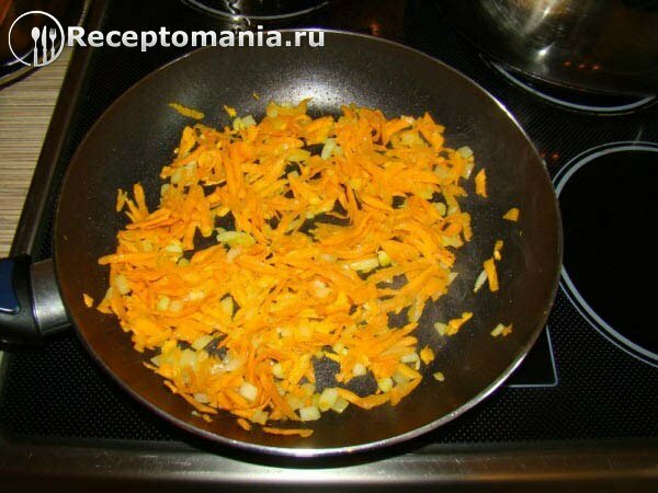 Нарезать лук и натереть на крупной терке морковь. Сделать зажарку. За 10 мин. до окончания варки добавить зажарку и посолить.