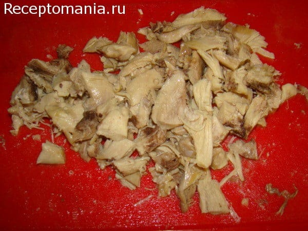 По желанию отделяем мясо курицы от костей и опускаем снова в бульон.