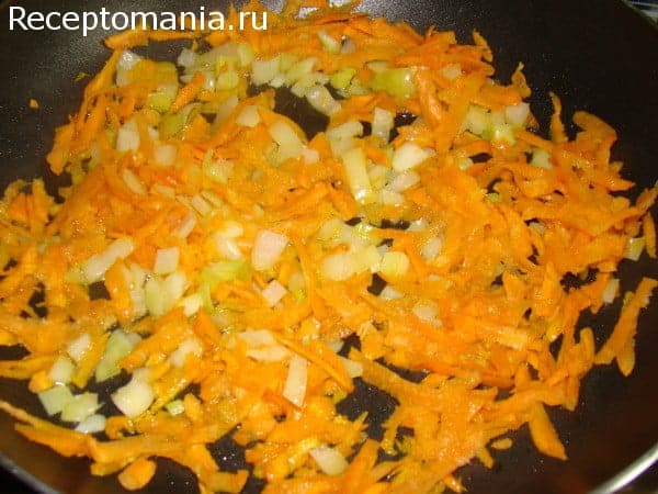 Делаем зажарку. Обжариваем на растительном масле морковь, натертую на крупной терке, и лук, нарезанный кубиками. Добавляем в суп вместе с помидорами. Варим 10 минут.