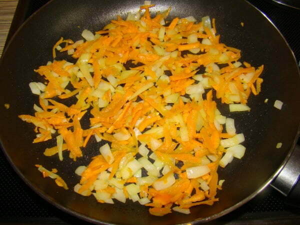 Вместе с лапшой кладем зажарку. Предварительно обжариваем лук, нарезанный на мелкие кубики и морковь, натертая на крупной терке. Варим 10 минут.