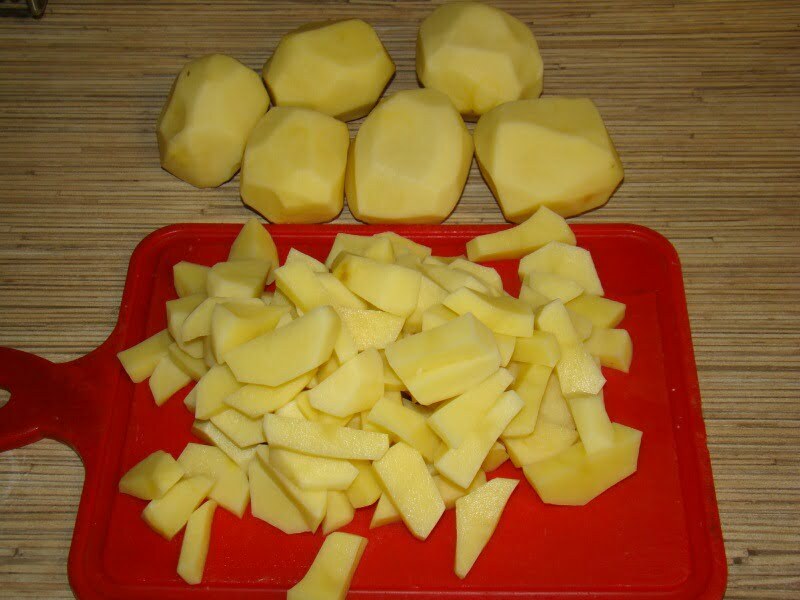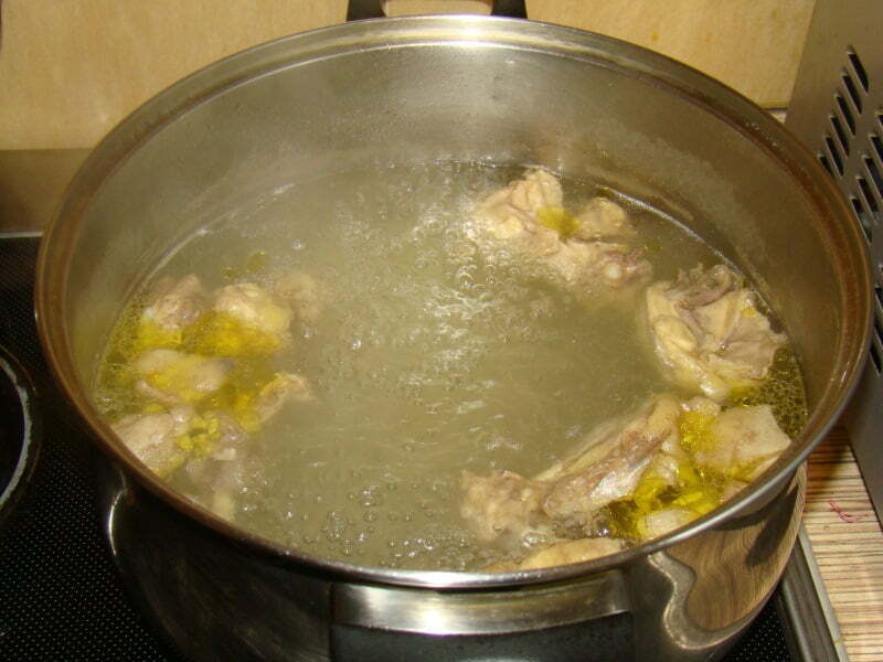 В кастрюлю с холодной водой кладем нарезанную кусочками курицу. Варим 30 мин.