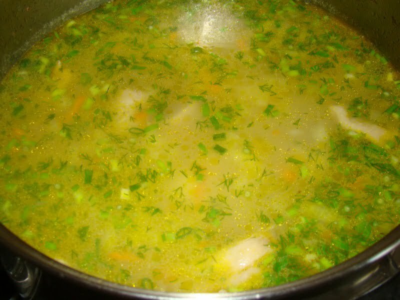 Нарезаем зелень, перекладываем в суп, солим, снимаем с огня.