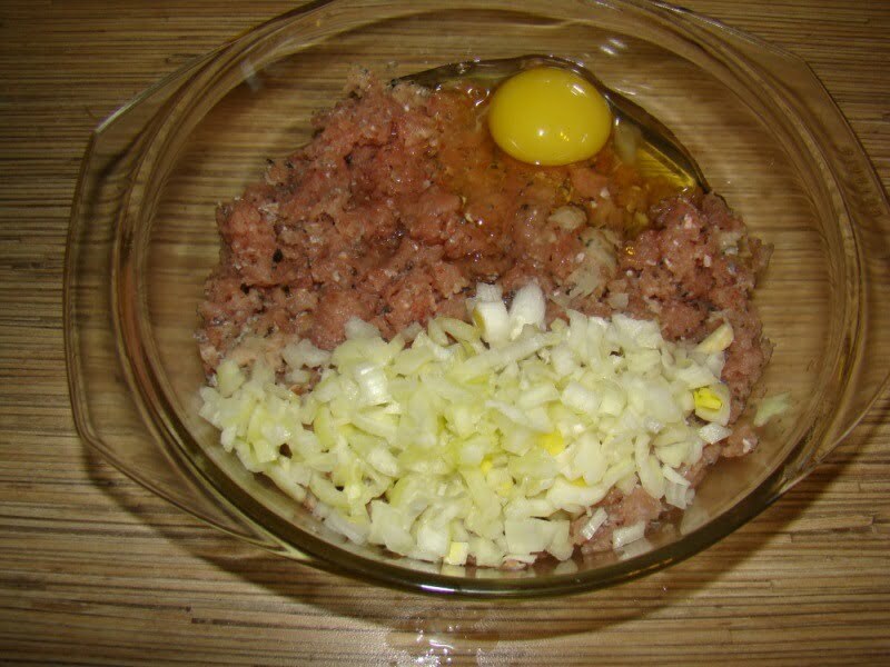 Для приготовления фрикаделек из красноперки в фарш добавляем яйцо и половинку мелко порезанного лука.