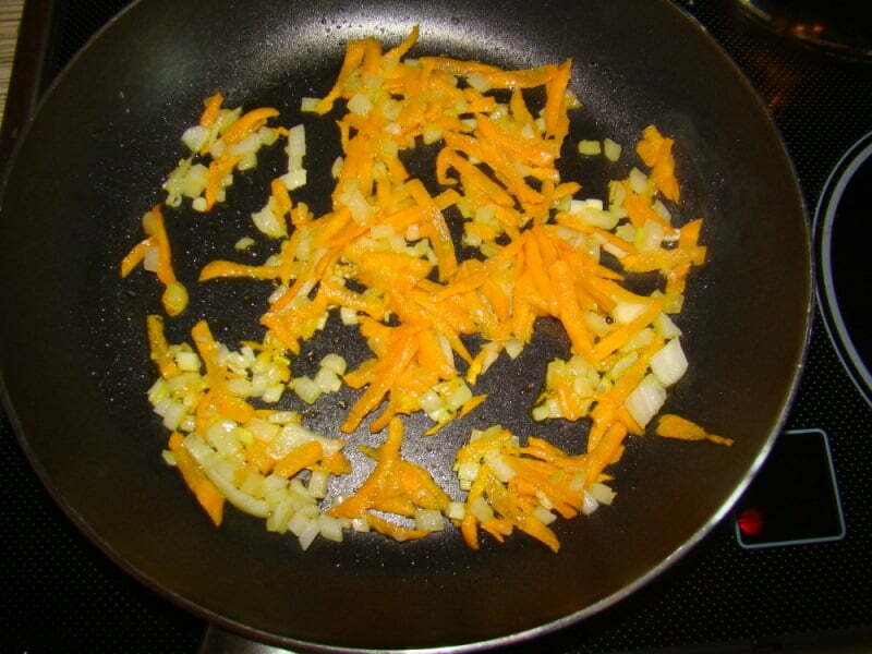 Пока они всплывают, делаем зажарку. Если лук большой, то берем половину и нарезаем кубиками, а морковь натираем на крупной терке, одновременно перекладываем на сковороду и немного обжариваем.