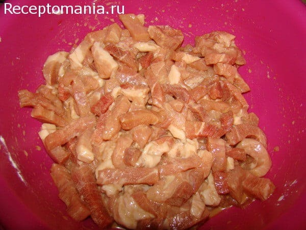 Нарезаем свинину и добавляем к ней кляр из крахмала и соевого соуса, перемешиваем и оставляем мариноваться на 30 минут, чтобы мясо хорошо пропиталось соевым соусом и просолилось.