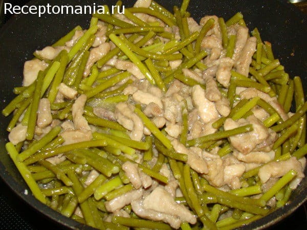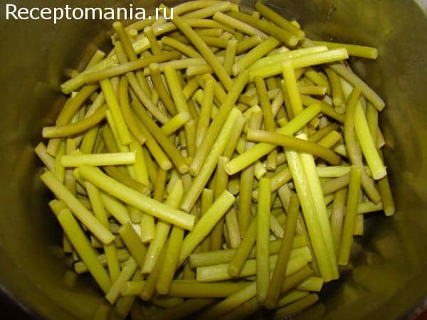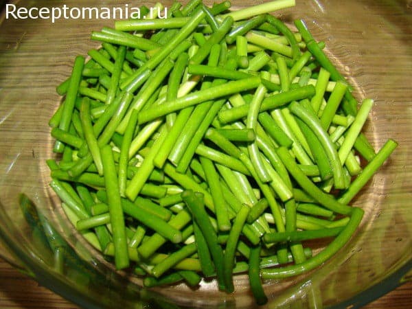 Свинина – 500 гр. Стрелки чеснока – 400 гр. Растительное маслоДля кляра: