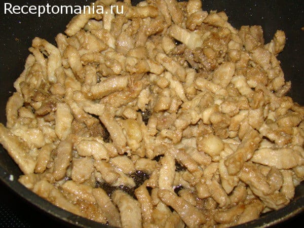 На хорошо разогретую сковороду с растительным маслом перекладываем свинину и обжариваем на среднем огне 30 минут постоянно помешивая.