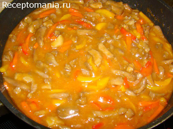 После добавляем мясо и овощи. Тушим 10-15 минут, периодически помешивая.