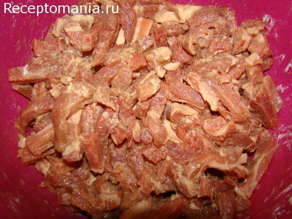 Нарезаем свинину и добавляем к ней кляр из крахмала и соевого соуса, перемешиваем и оставляем мариноваться на 30 минут, чтобы мясо хорошо пропиталось соевым соусом и просолилось.
