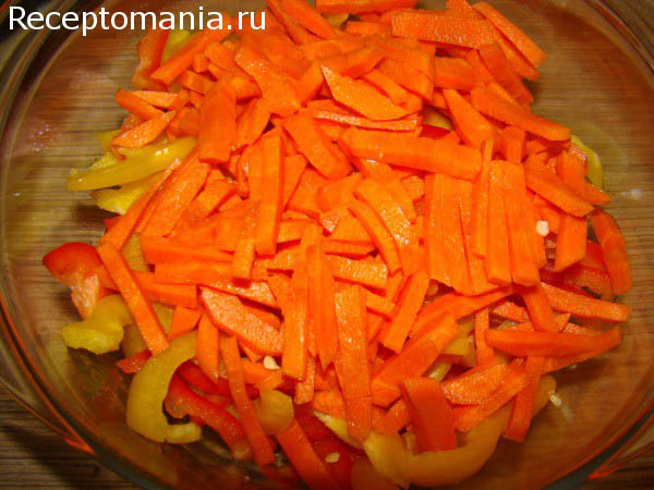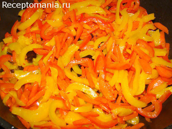 Приготовим овощи. Для этого на растительном масле обжариваем морковь и перец 20 минут.
