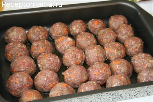 Из фарша лепим тефтели и выкладываем в глубокий противень, достаточно хорошо смазанный растительным маслом. Ставим в разогретую духовку до 160-180 градусов на 15 минут.