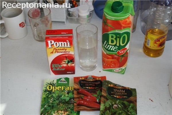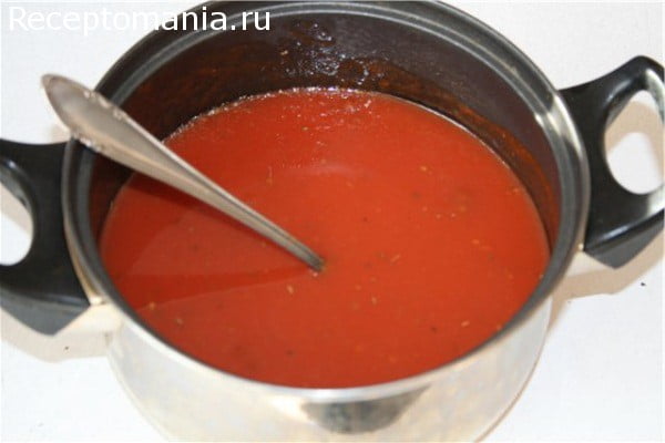 Приготовим соус для тефтелей. Для этого в посуде смешиваем томатный сок, протертые томаты, сахар, 1 ст.л. растительного масла, 1 ч.л. красного перца и специй (орегано и итальянские травы). Протертые томаты можно использовать покупные или приготовленные в домашних условиях. Для этого очищаем маринованные помидоры от кожуры и растираем до однородной массы.