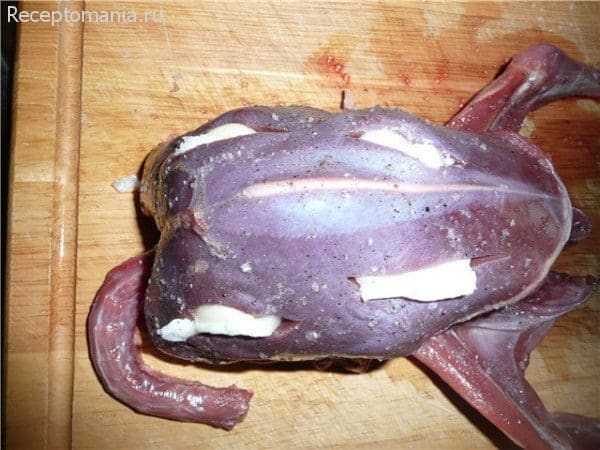 Тетерева натираем солью и перцем, на грудке делаем надрезы и помещаем в них кусочки сала и чеснока. Вовнутрь птицы кладем нарезанный полукольцами лук, несколько кусочков сала и долек чеснока.