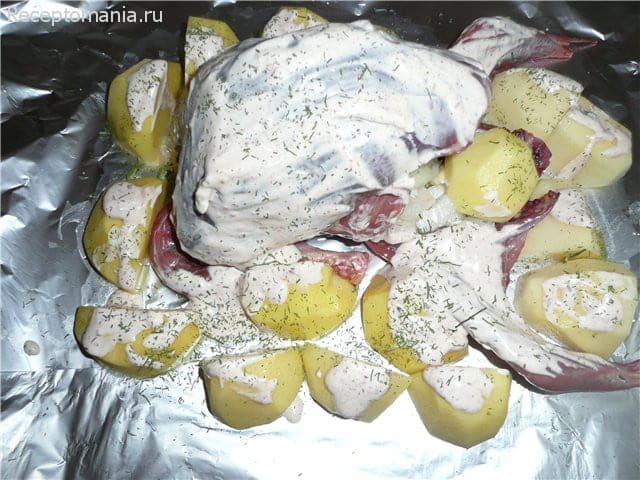 Застилаем противень фольгой, смазываем растительным маслом, выкладываем птицу. Вокруг укладываем картофель, смазываем все соусом из сметаны и аджики. Пропорции берем по вкусу. Далее посыпаем приправой для птицы или просто любимыми травами.