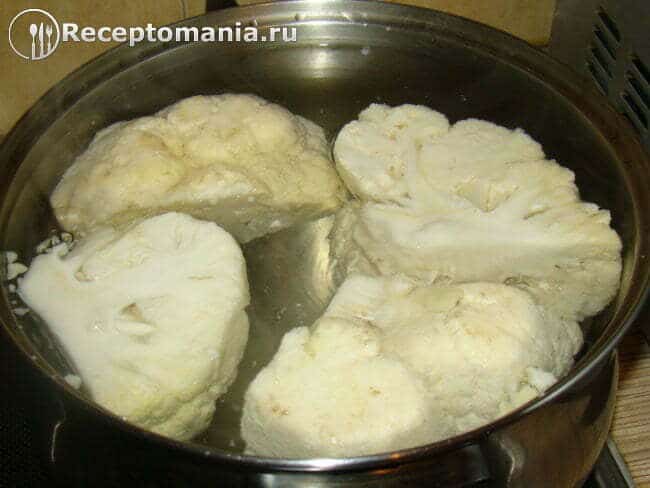 Цветную капусту разрезать на четыре части и опустить в кипящую подсоленную воду. Варить 10-15 минут.