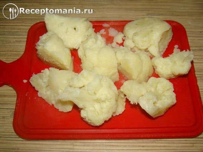 Слить воду, даем цветной капусте остыть. После разделить ее на соцветия или разрезать на куски.