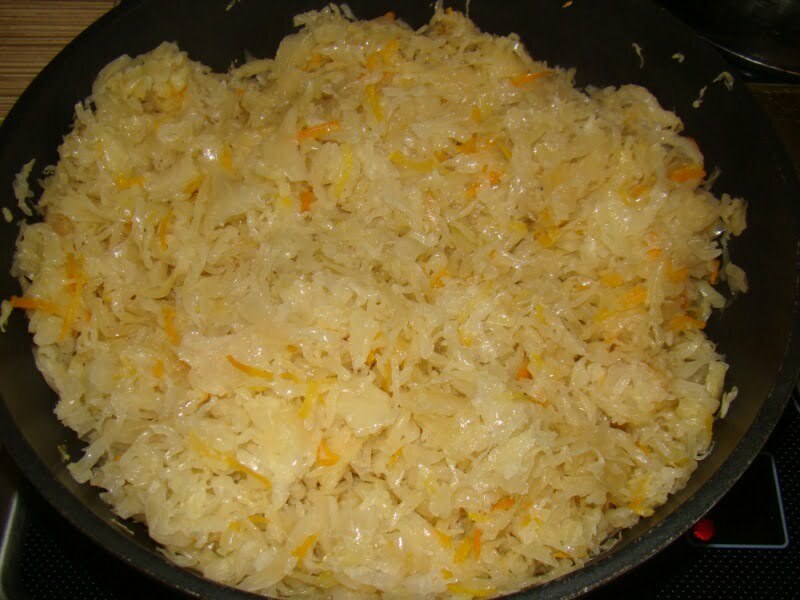 Если квашеная капуста очень кислая промыть под холодной водой, отжать. В сковороду наливаем масла, разогреваем и перекладываем капусту.