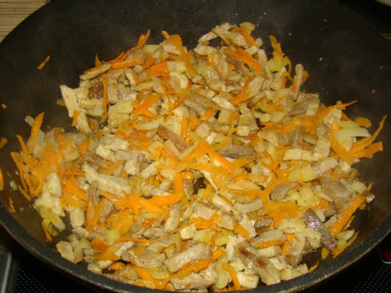 Добавить измельченный лук и морковь, обжариваем до полуготовности.