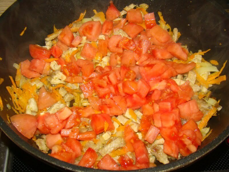 Помидоры очистить и нарезать кубиками, переложить в сковороду и тушить 3 мин.
