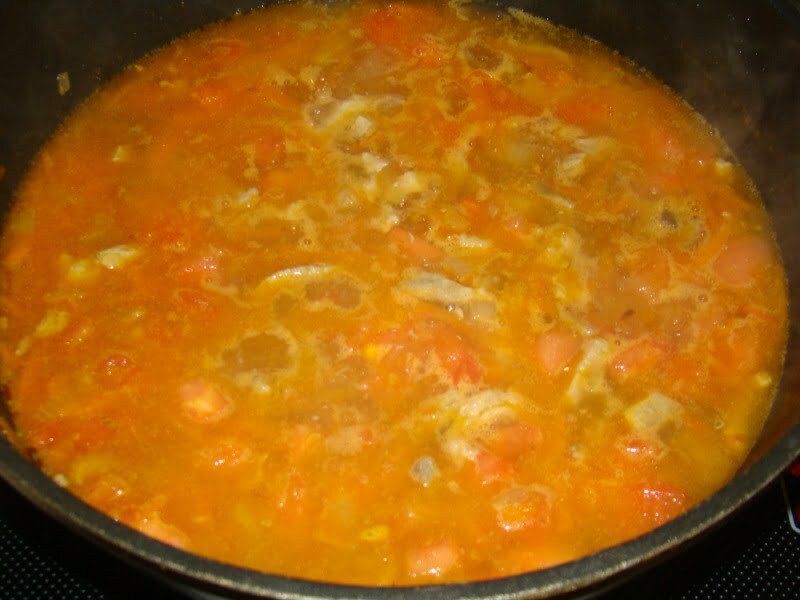 После налить 500 мл кипятка, следом кладем сахар и соль. Потушить 3 мин.