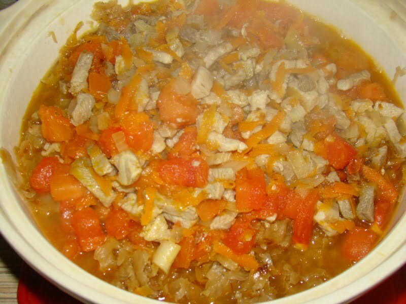Все перекладываем в кастрюлю с капустой, перемешиваем и ставим в духовку, разогретую до 200 градусов. С момента закипания готовим 30-40 мин.