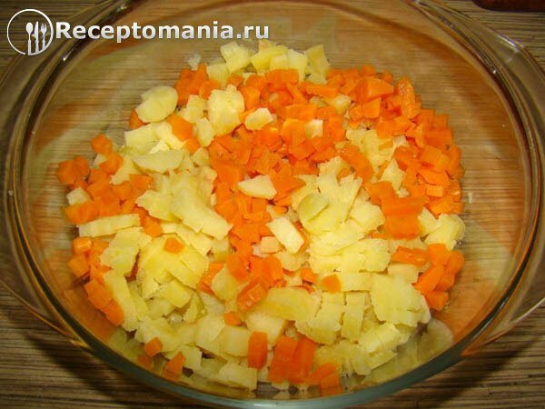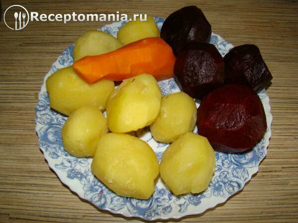 Отварить картофель с морковью 20-30 минут, свеклу около часа. Овощи очищаем от кожуры.