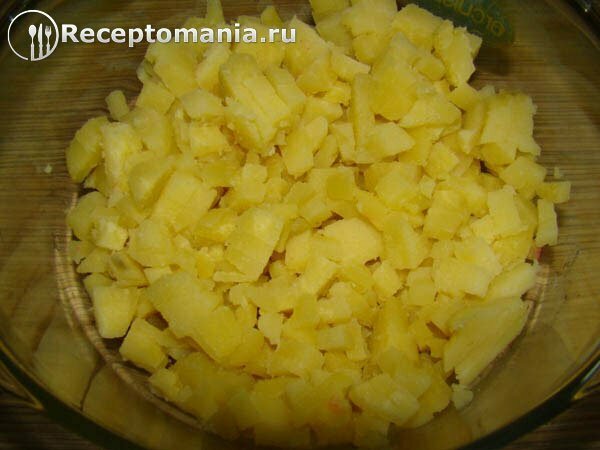 Все ингредиенты салата нарезаем небольшими кубками. Начнем с картофеля.