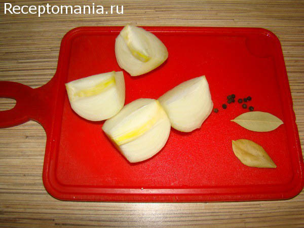После добавляем лук, разрезанный на 4 части, лавровый лист, перец горошком, соль.